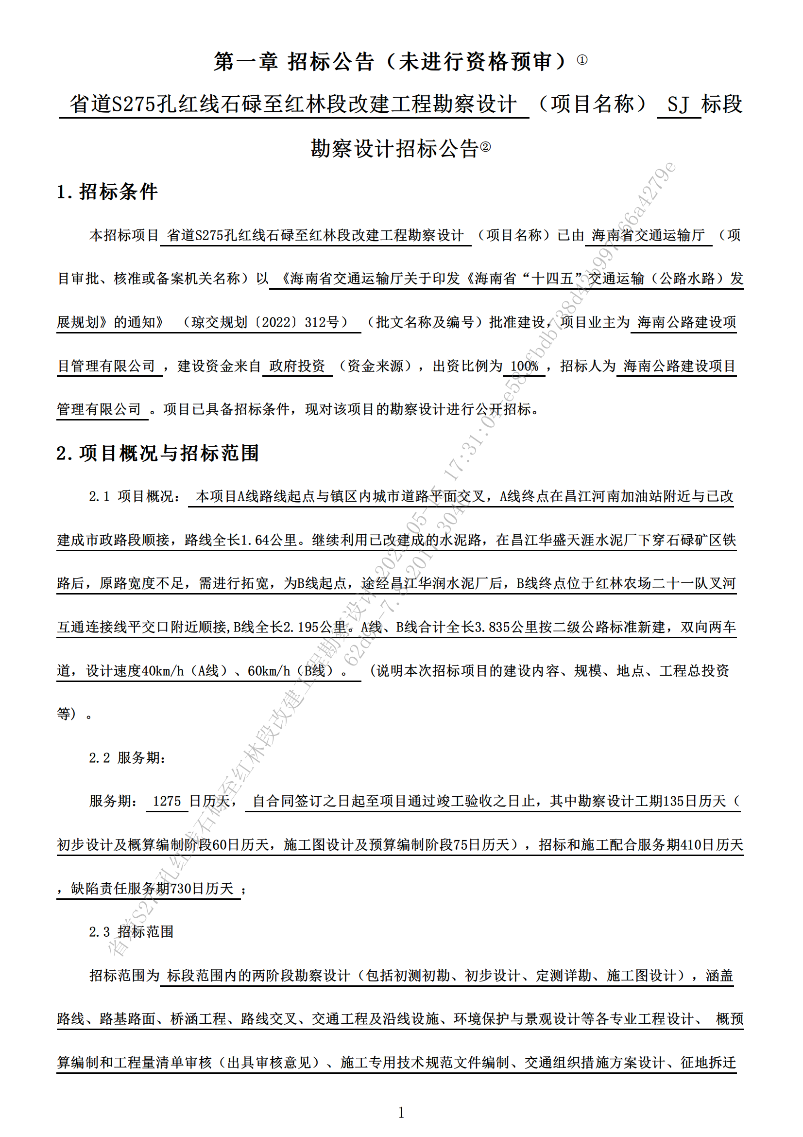 省道S275孔紅線石碌至紅林段改建工程勘察設(shè)計招標公告